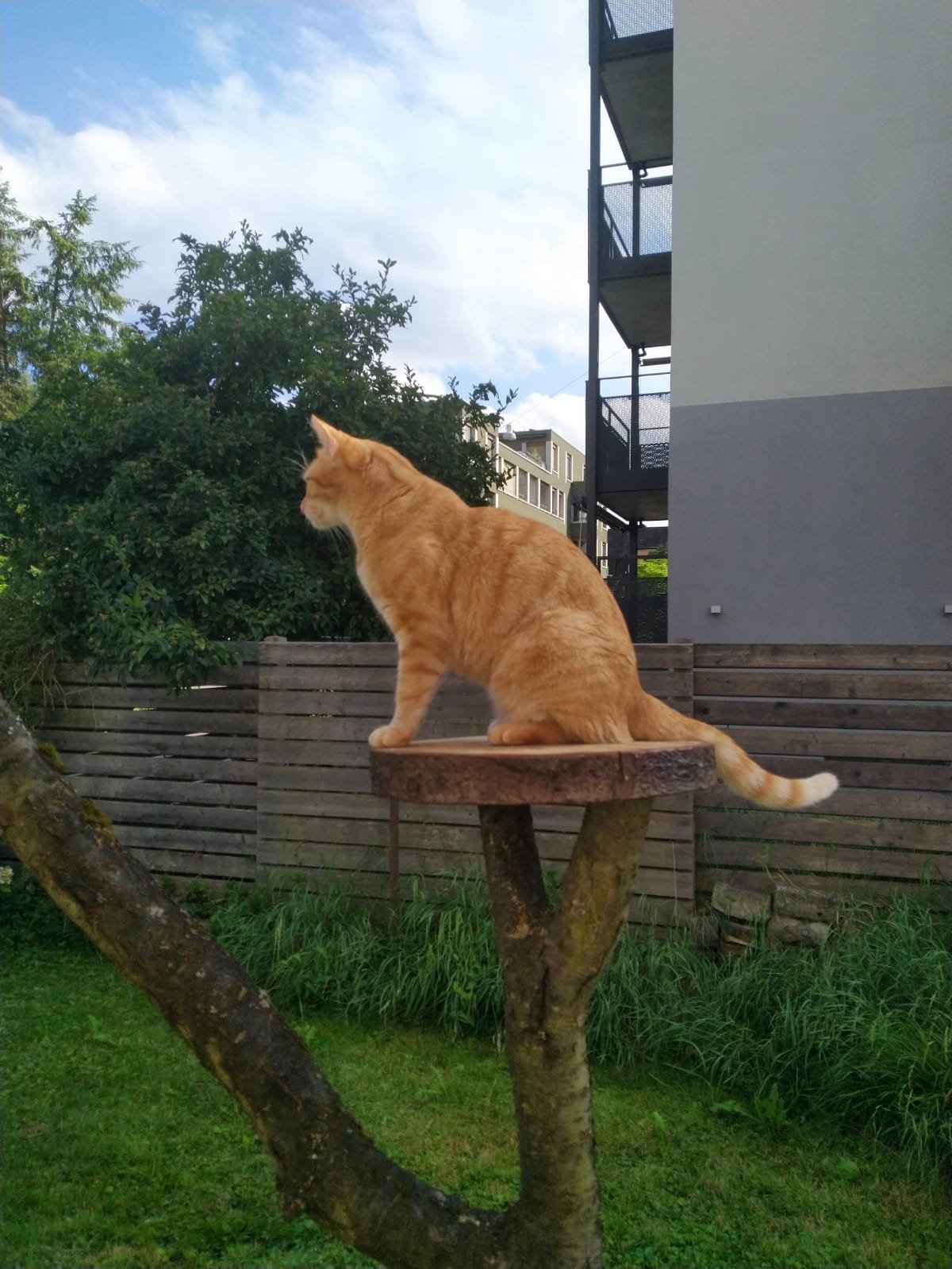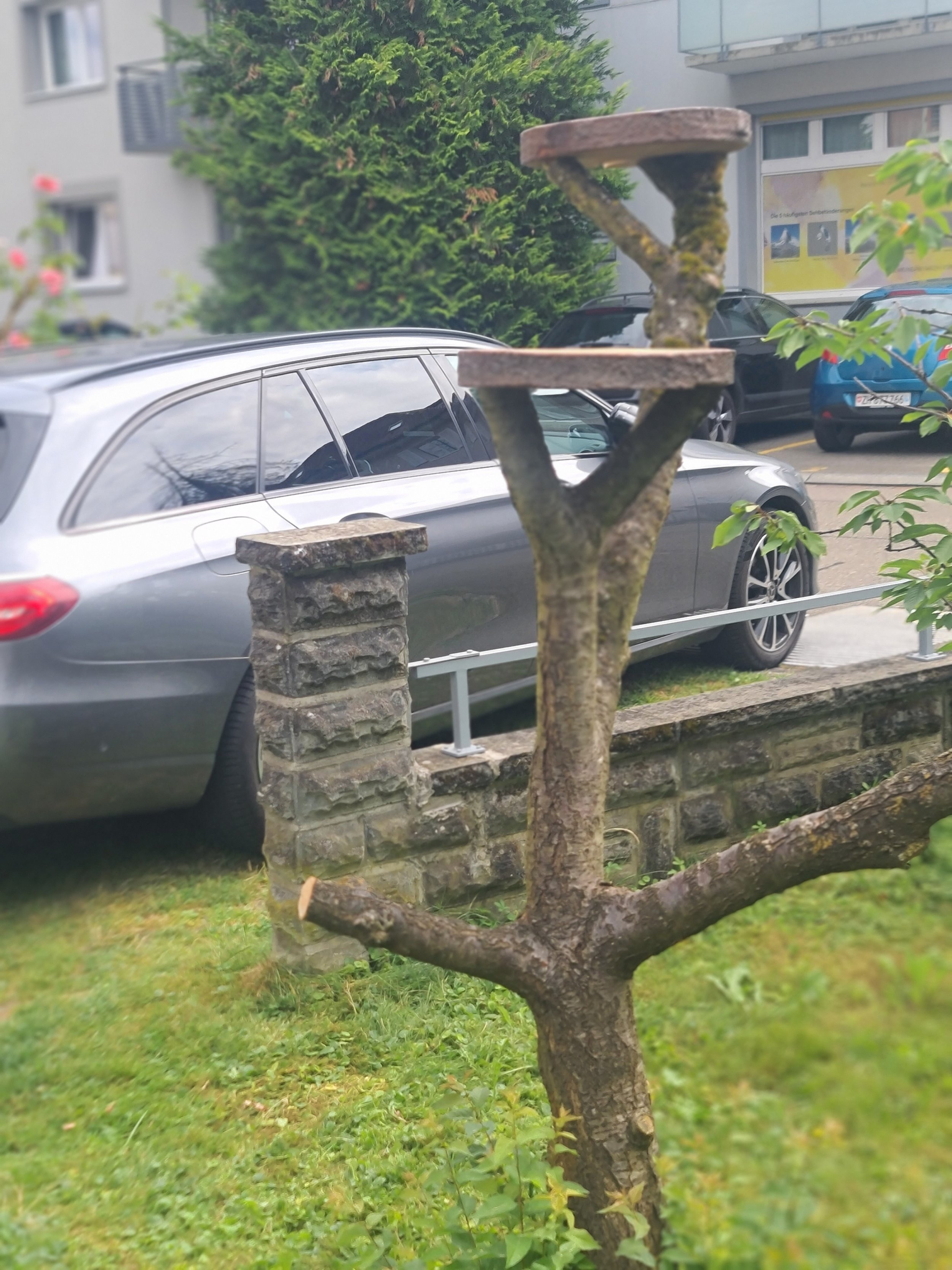 Neben dem Aussenparkplatz stand ein Apfelbaum ohne Äpfel. Er wurde am Welt Katzentag kurzerhand in einen Katzenkletterbaum umfunktioniert. Was die Kundin und die Katze freute.