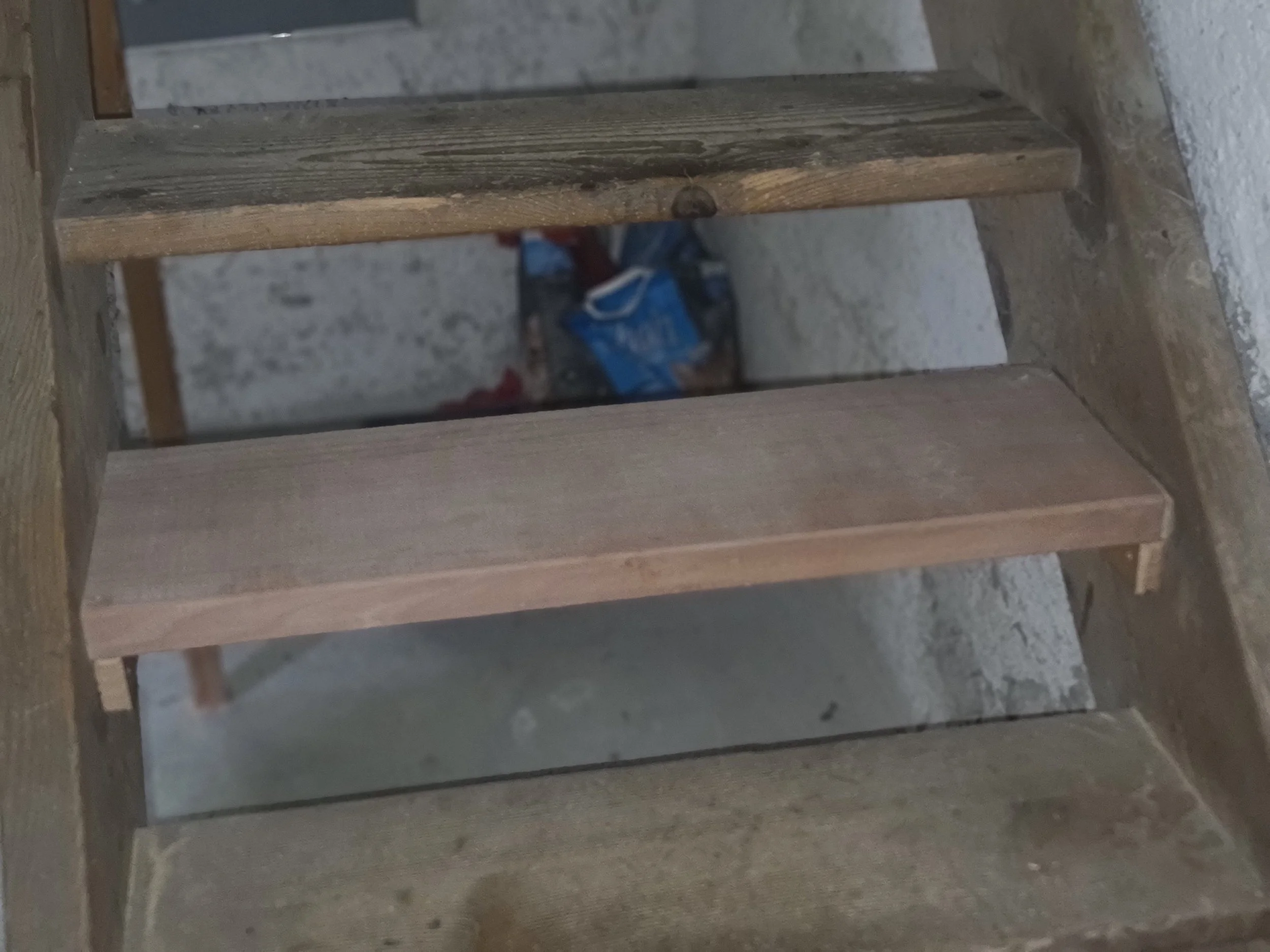 Beim Projekt Holztreppe, handelt es sich auch um eine Arbeitskollegin, die ein Problem erzählte. Sie erzählte, dass die Holztreppe im Kellerabgang sehr brüchig sei. Vor Ort stellte sich heraus, dass die Treppenstufen vom Wurm komplett zerfressen sind. Die beschädigten Stufen wurden aus der Treppe demontiert und durch neue ersetzt.
